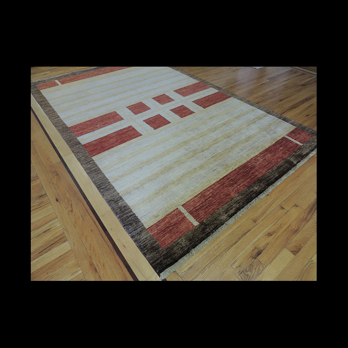 Modern design red, beige, gold, and brown. This geometric modern pattern is reminiscent of a Rothko art painting. The bold red is fun yet softened by the otherwise neutral colors of beige and chocolate brown; it would make a statement in any room. A Genuine Oriental Hand-made (knotted) Rug. One-of-a-kind