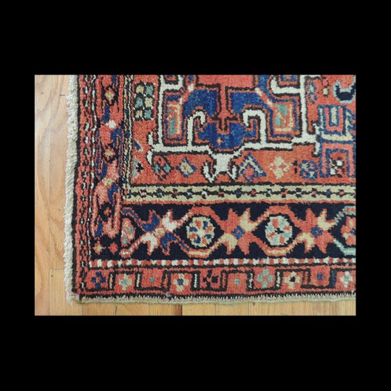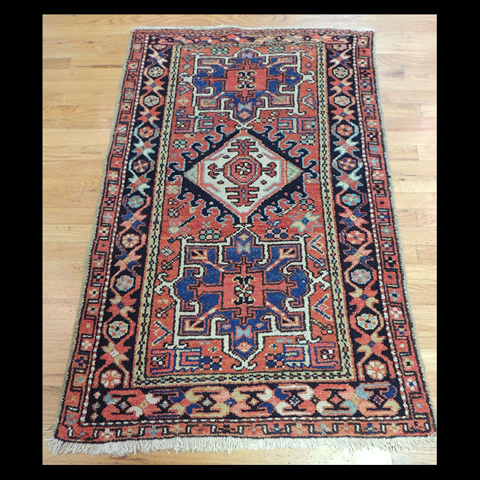 Red/Blue. Beautiful color configuration with tones of navy and French blue over a red background with an all-over design. Very tight weave. Great for office, library, doorway, or any small decorative area in your home. A Genuine Oriental Hand-made (knotted) Rug. ANTIQUE RUG. One-of-a-kind