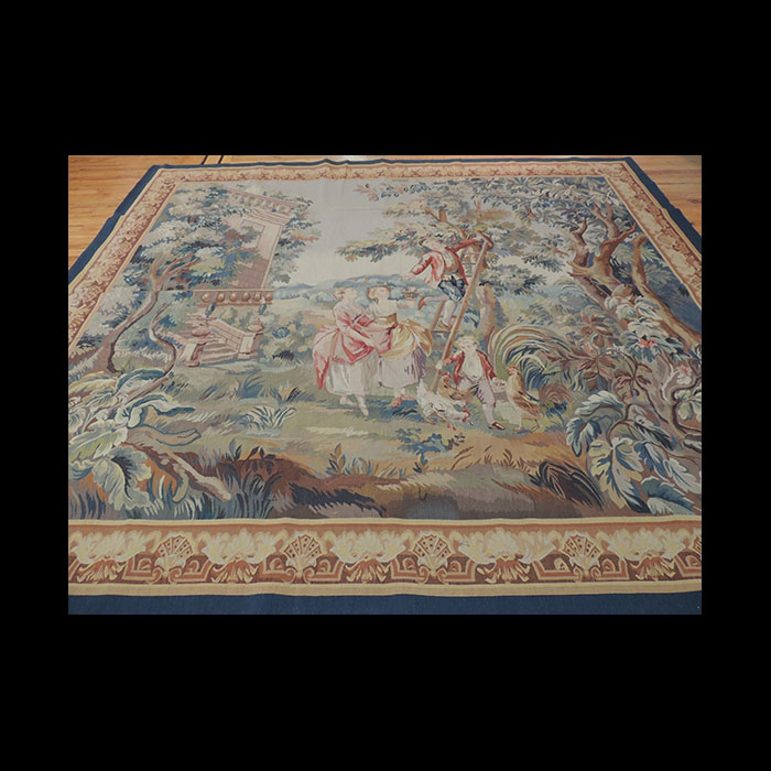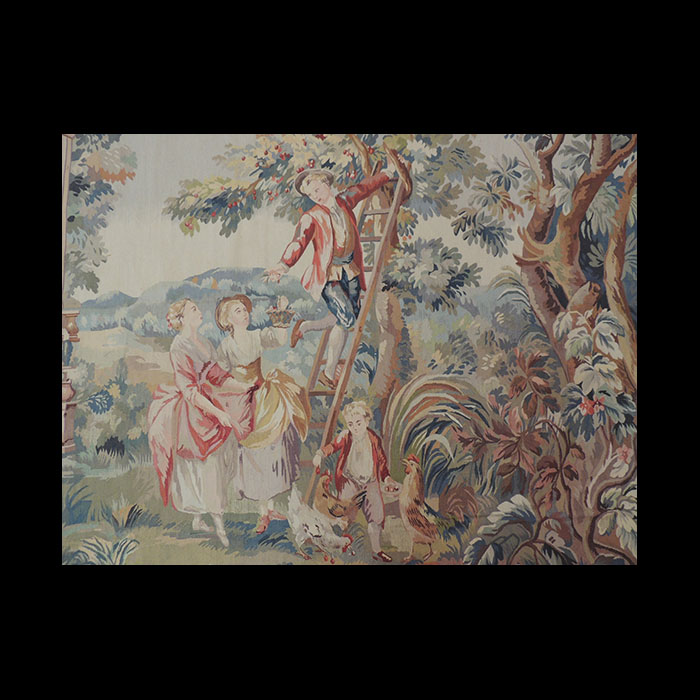 With maidens and a young boy on a ladder, while another is feeding chickens and a rooster below. A luscious landscape setting of a serene carefree moment caught in time one afternoon by the tree. A playful lovely scene of art to adorn any room. A Genuine French Tapestry Hand-made (knotted) Rug One-of-a-kind