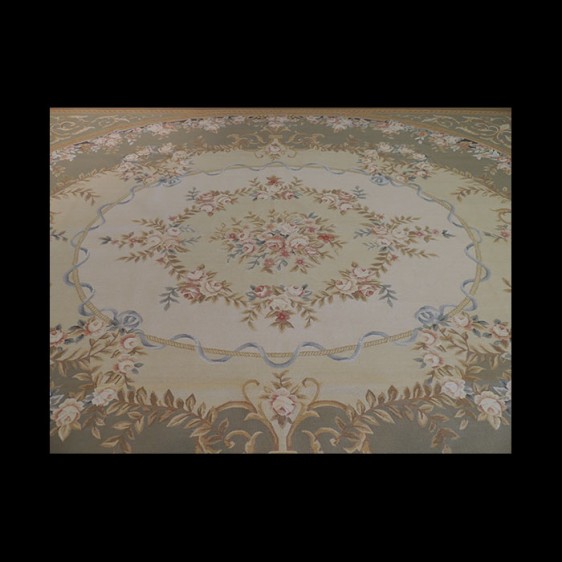 With a center medallion and all-over design. The soft moss green color is truly unique, accented by an inner border of flowers, ribbons and swirls on a neutral beige, gold and dark tan border. This is truly a magnificent addition to any room.