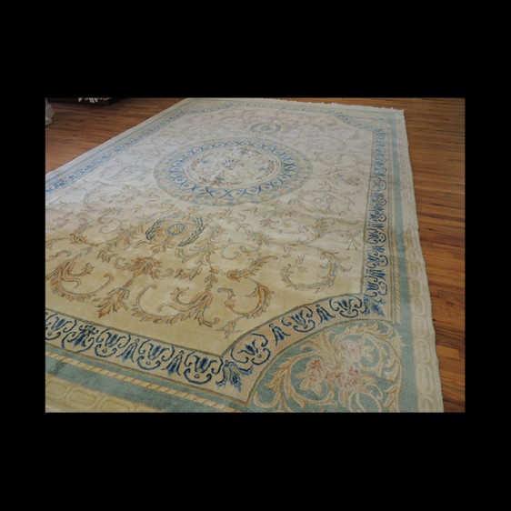 Beige Blue. Very good condition. This center medallion design is simply breathtaking with a stunning soft teal blue outer border, with corner medallions. It has a navy patterned inner border, and accents of soft rose and gold. Truly a work of art. A beautiful addition to any room in your home. A Genuine Oriental Hand-made (knotted) Rug. ANTIQUE RUG. One-of-a-kind