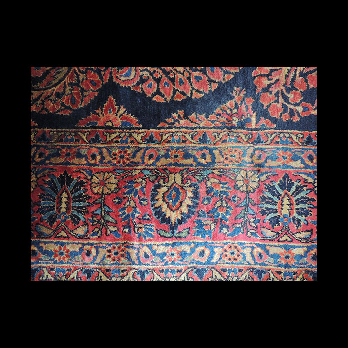 With navy background, finely-knotted, like new, brilliant red and gold color configuration, all-over design.