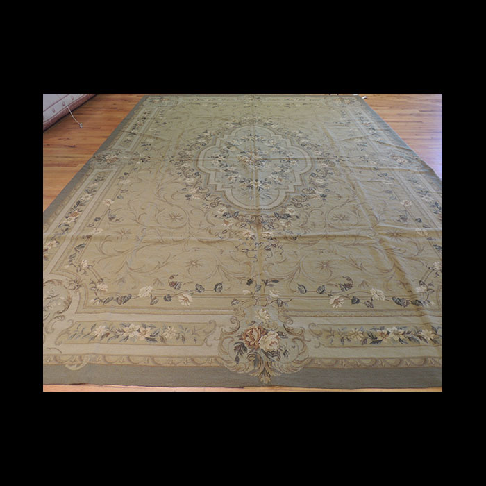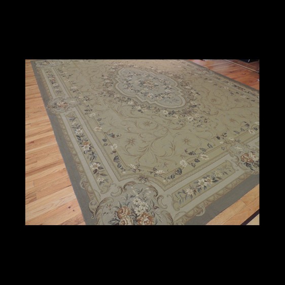 With a center medallion and all-over design on a lovely soft avocado green background and darker olive green border. The swirls and floral patterns make for a lovely elegant rug. The soft all over green color is truly unique and neutral in design for any room. A Genuine Oriental Hand-made (knotted) Rug One-of-a-kind