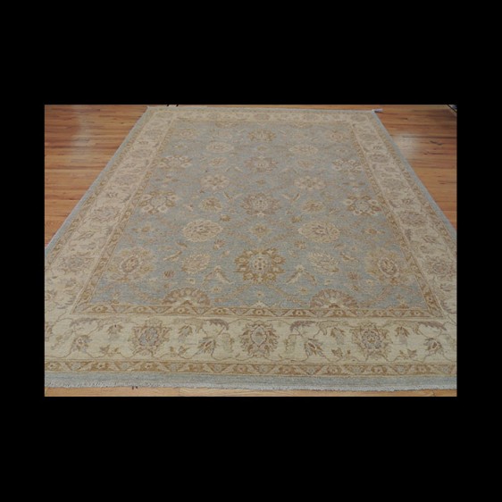 In a soft blue and beige/gold all over pattern. These soft neutral tones make it very desirable; it is a perfect addition to any room. A Genuine Oriental Hand-made (knotted) Rug. One-of-a-kind
