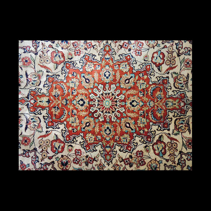 Exquisite red border with center medallion design. Excellent condition, full pile.