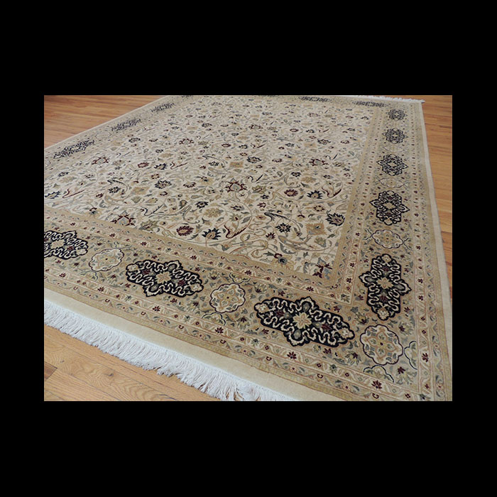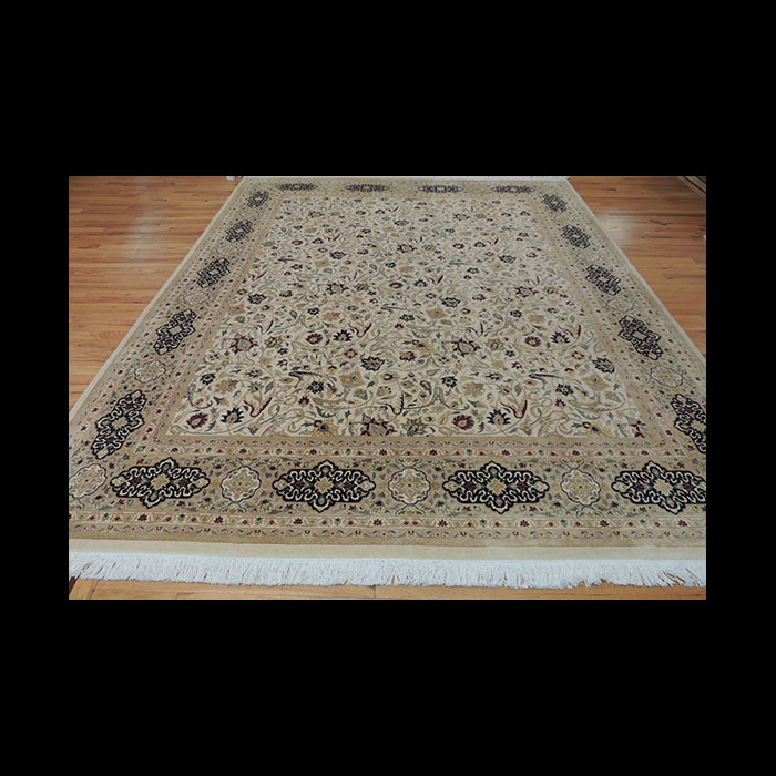 Beige, Navy, Gold. This all over pattern of swirls of flowers in golden yellow and brick red sit over a neutral cream center color, surrounded by rich border of navy medallions. A beautiful addition to any room. A Genuine Oriental Hand-made (knotted) Rug. One-of-a-kind